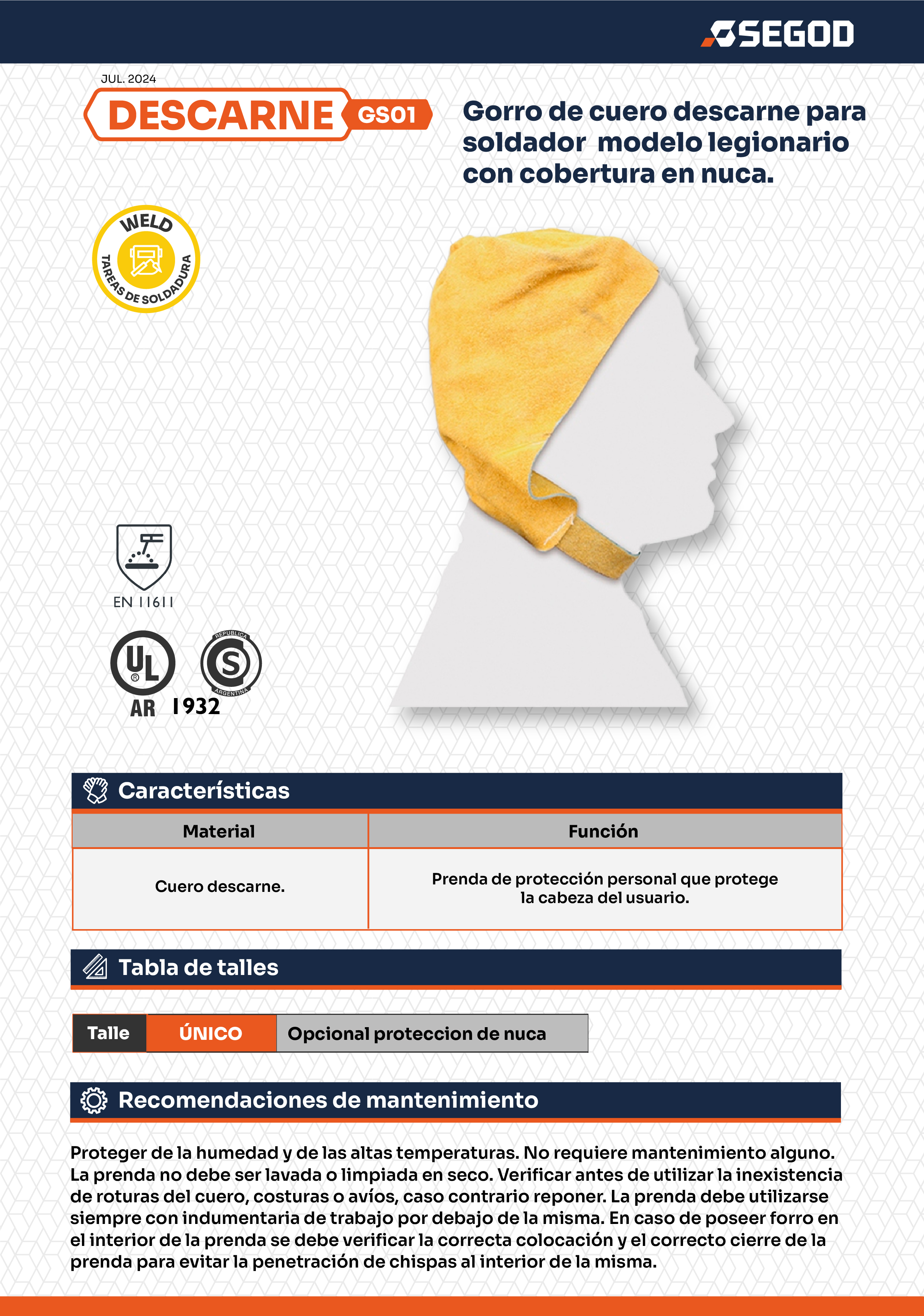 Gorro de cuero descarne para soldador modelo legionario con cobertura en nuca.